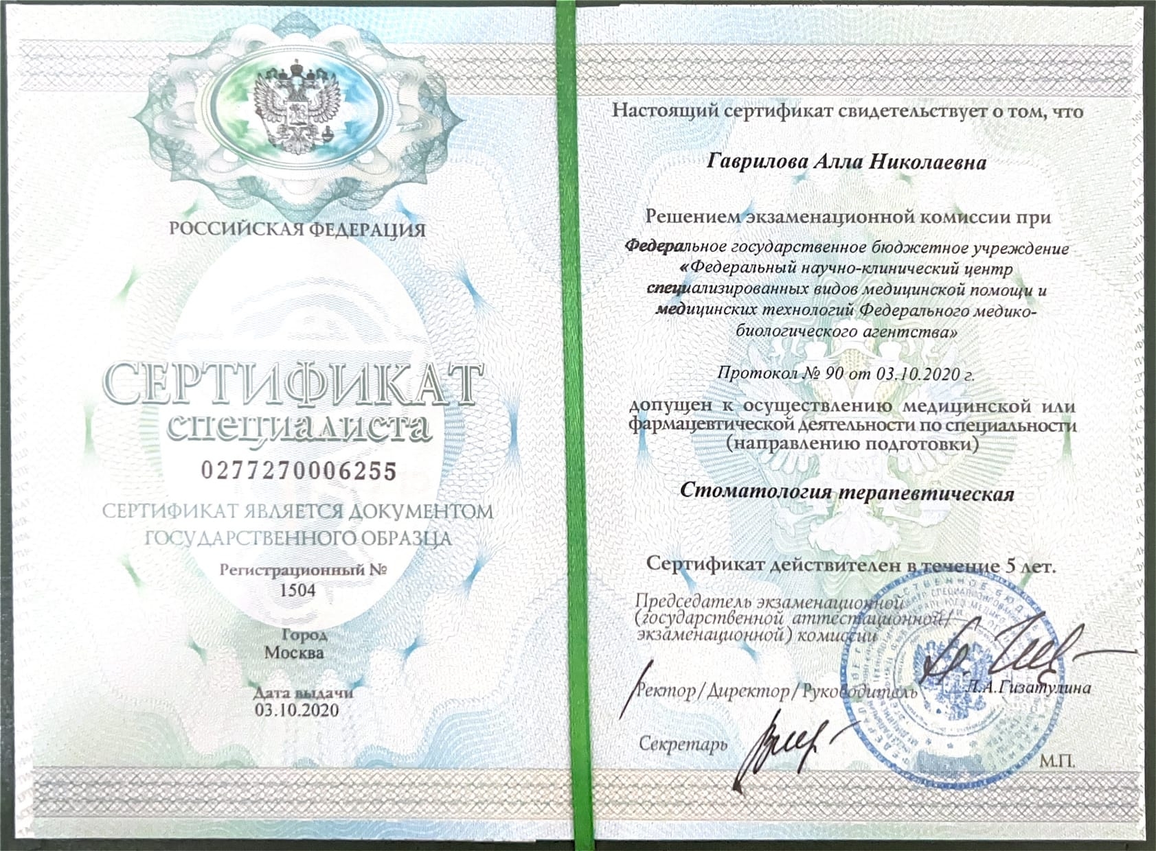 - ФГБУ Государственный научный центр Российской Федерации — Федеральный клинический биофизический центр им А. И. Бурназяна. «Стоматология терапевтическая», 2015 г.
