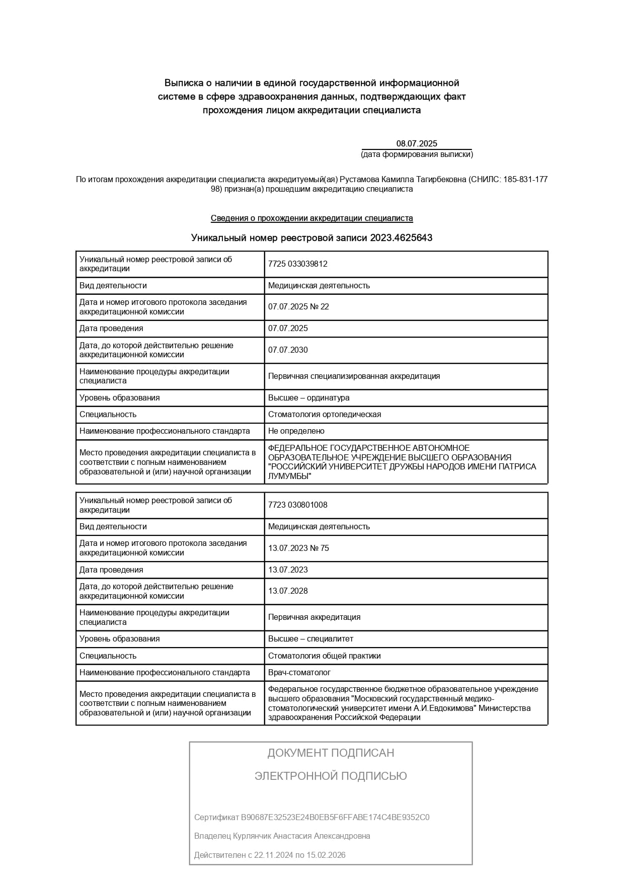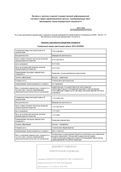 - Ординатура: Российский университет дружбы народов / Ортопедическая стоматология, 2025 г.